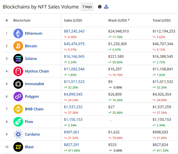also declined -50.01%, but as NFT season ramps up, so does wash trading. Wash sales are up +17.76% to $24.94m this week.