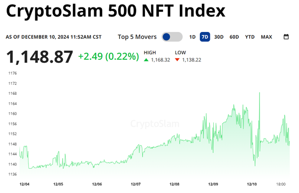 The CryptoSlam 500 NFT Index is up +0.22% in the past 7d, giving us our first 2-day green streak of the year. Crypto prices are ranging, with Bitcoin now at $96k, but NFT prices are largely up over the past week.