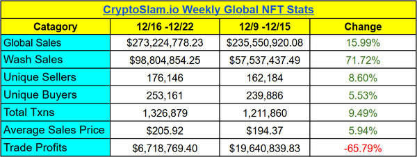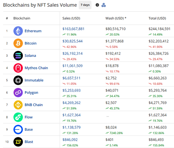 more than every other blockchain combined. In total we saw $162.51m in sales, a +10.64% increase from the prior week. Buyers were up +44.77%, and wash sales up +16.54% to $79.4m.