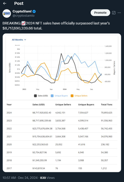 Even with the strong EOY sprint, I’m shocked by what has transpired in NFTs. Sales in 2024 have actually surpassed 2023’s sales. As of just this morning, the NFT market reached $8,717,920,832.40 in sales, beating last year’s $8,717,690,339.66. It’s something many thought impossible, not because last year was so hot, but