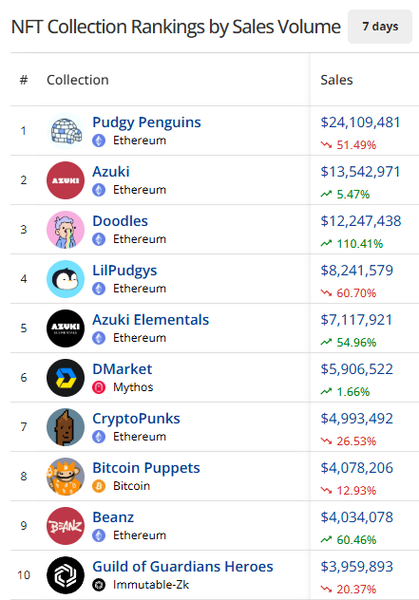 - Pudgy Penguins are the #1 collection in NFTs again this week, even with sales down -51.49%. In total, the Pengus saw $24.1m in sales, after the team’s hot $Pengu token drop last
