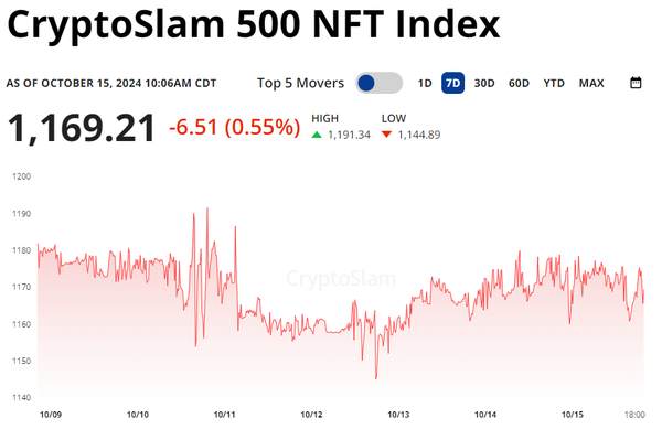The CryptoSlam 500 NFT Index is down -0.55% in the past 7d as the NFT market continues its 4-week skid. Unlike the previous 3 weeks, this week reflects some stability as crypto prices are up and NFTs pick up momentum.