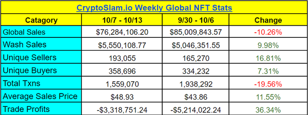 The NFT market was a mixed bag last week, and while sales volume was down, there certainly seems to be more people participating. Buyers hit a 25-week high, and sellers an 18-week high. Average sale prices are creeping back up thanks to big NFT sales, and trade profits have had their second-best week since the beginning