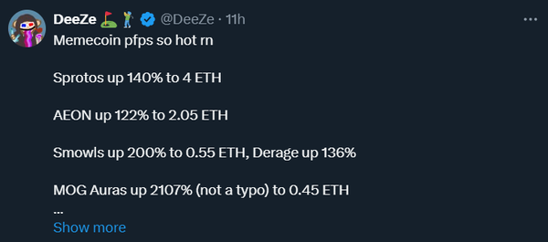 Last week we talked about the new NFT meta of “cult” NFTs. These are NFT collections backed by top-tier memecoins. This week it has become clear that not only is the meme NFT meta what will define the upcoming crypto and NFT run, but that the run is now here. Project AEON, Sproto Gremlins, Retardio Cousins, Milady Maker, Bitcoin Puppets, Mog Auras, Based Angels, and multiple other meme NFT collections saw serious price action over the past 7d. This likely cemented them as the next top-tier NFT collections and also signaled that the run has begun.