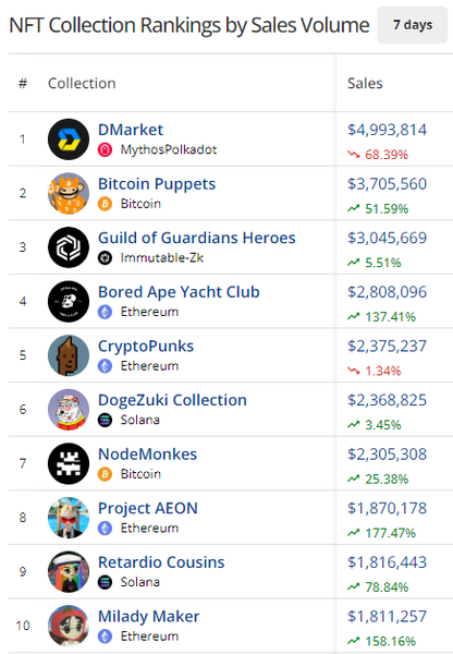 - Bitcoin Puppets had a monster week with $3.7M in sales. Buyers increased by +15.14% on the week as meme NFT collections took center stage. Puppets are one of the top cults on Bitcoin, and
