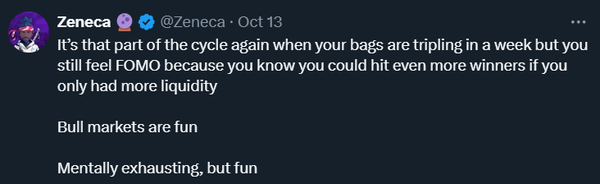 That’s the same thought process being applied to memecoins and NFTs right now, and exactly what the “we’re back”