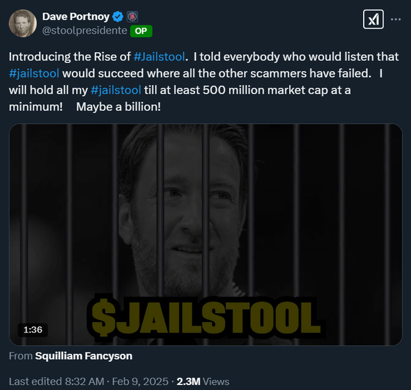 - Dave Portnoy is no stranger to crypto. He has long talked about his bitcoin trades and his experience in SafeMoon, but this week he found his way into the memecoin trenches. It started with the Barstool sports legend buying and tweeting about random memecoins and devolved into Dave basically taking over a token called Jailstool and promising to push the token to a $500m market cap. Will it actually materialize? It’s hard to say after alienating some of his biggest supporters like Choose Rich Nick. But Dave is a force to be reckoned with and has massive connections. Keep your eyes on this one.