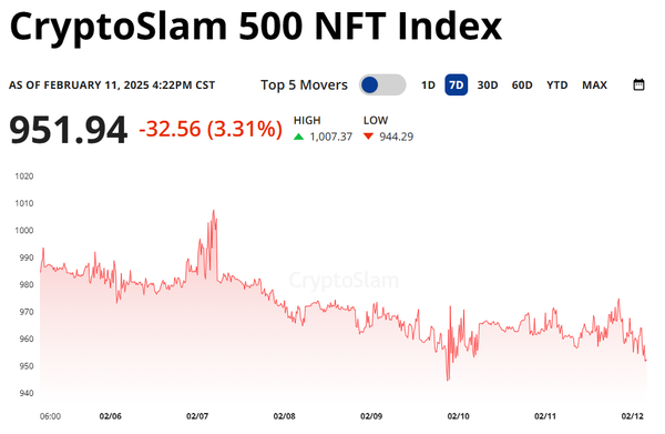 The CryptoSlam 500 NFT Index is down -3.31% in the past 7d as the NFT market continues searching for a bottom. So far in this short year the market is down -16.38% during a time that’s supposed to be the hottest few months for