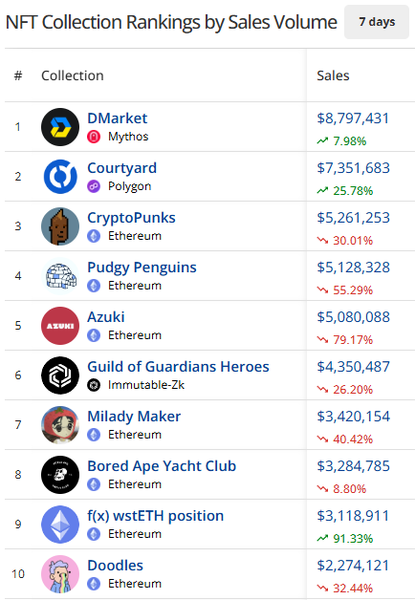 - DMarket is the #1 NFT collection by sales volume this week with $8.79m in sales. Sellers climbed +7.53% as gaming skins