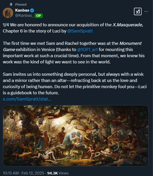 NFT art sales will one day flip the traditional art market. It’s a matter of when, not if, and last week we saw a major milestone on that journey. Sam Spratt, whose previous work titled The Monument Game sold for over $700K, recently revealed his new 1/1 work, Masquerade. Within days the stunning work sold via a private sale for $3M to a private buyer named Kanbas.