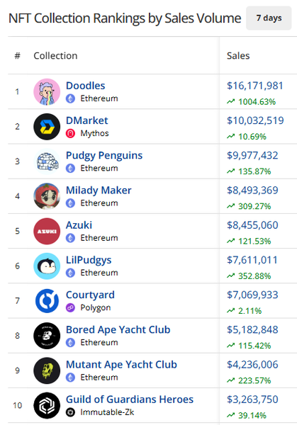 - Doodles are the #1 collection in the past 7d thanks to hype for their DOOD token plus bonus XP on OpenSea trading. Sales were up +1,004.63% to $16.17M, with