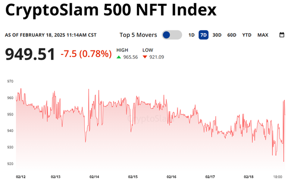 The CryptoSlam 500 NFT Index fell -0.78% in the past 7d. Bitcoin is down -2.3%, ETH -4.6%, and Solana -9.5% over that period, which impacts the USD value of NFTs. Luckily some of the top NFT collections saw floor price increases in the
