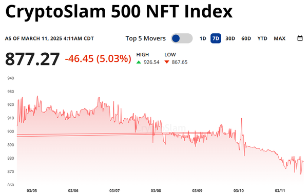The CryptoSlam 500 NFT Index fell -5.03% in the past 7d as the value of the NFT market plummeted with the crypto market. Is this the start of a bear market, or is this a mid-cycle pullback? Nobody knows yet, but what we know for sure is that