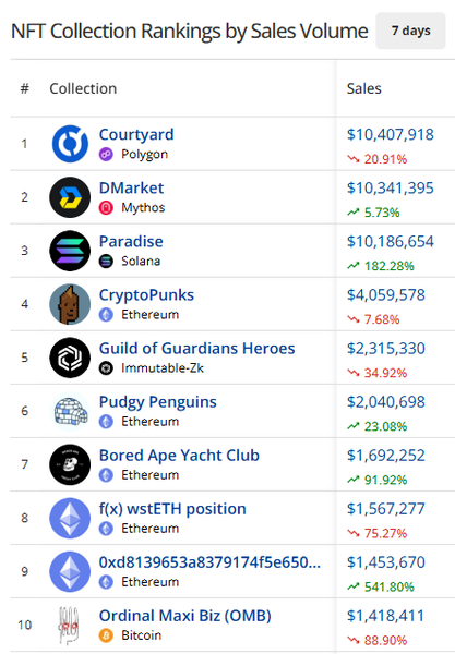 - Courtyard is again the #1 collection by sales volume again, even with sales down -20.91% to $10.4M. Buyers fell -15.37% to 5,451.