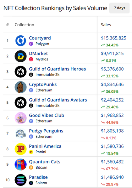 The NFT market found a bit of stability this week with collectors enjoying non-Web3-native products like Courtyard, DMarket, Panini, and Sorare (rank 1, 2, 8, and 11, respectively). These collections tokenize sports collectibles and gaming skins