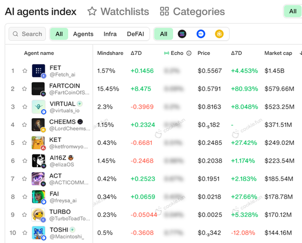 AI tokens saw a resurgence this week as the broader crypto market saw a recovery. Fartcoin led the charge, seeing its market cap increase by +80.96% on the week to $579.66M.