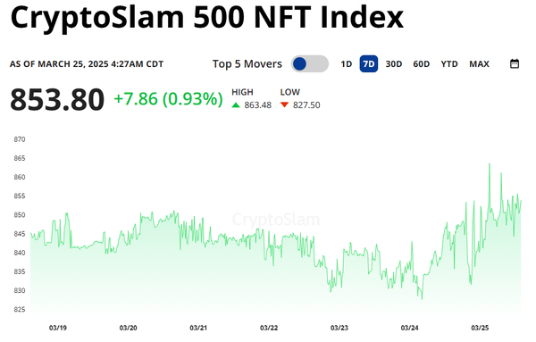 The CryptoSlam 500 NFT Index is finally in the green, up +0.93% and breaking an 8-week streak of declining value. The market is boosted by rising crypto prices along with floor prices as traders plan for a hopeful NFT run.