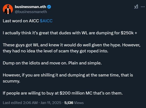 Their $AICC token was sold in a presale to a select few lucky participants who magically were able to turn their .5 SOL investments into $250k, or 5 SOL into $1.8m. Suffice to say, the easy win and exclusivity of the opportunity turned off the community who were quick to call this a scam.