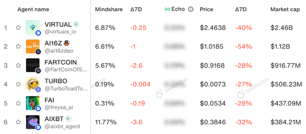 AI crypto was down, along with the rest of the market in the past 7d, with many of the top AI tokens falling 25-50%. Zerebro saw some of the biggest losses of the top 15 agents, seeing its market cap fall a staggering -57% to $223m. This may continue even when the market rebounds, as many AI agents have been exposed to not much more than wrapped LLMs.