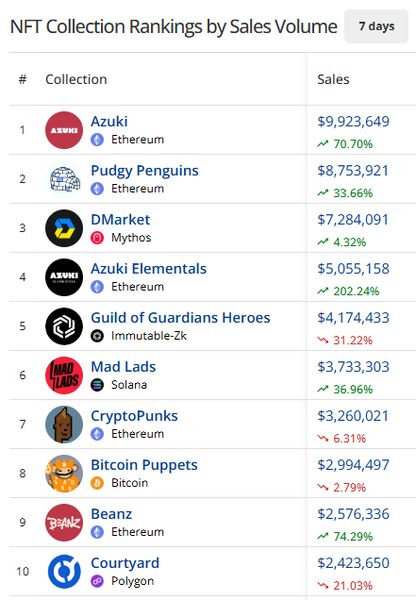 Sales: $5.05M (+202.24%) Buyers: 440 (+143.09%) Top Sale: Azuki Elementals #11490 | 50.00 ETH ($184.03K) Average Sale Price: $6,980.62