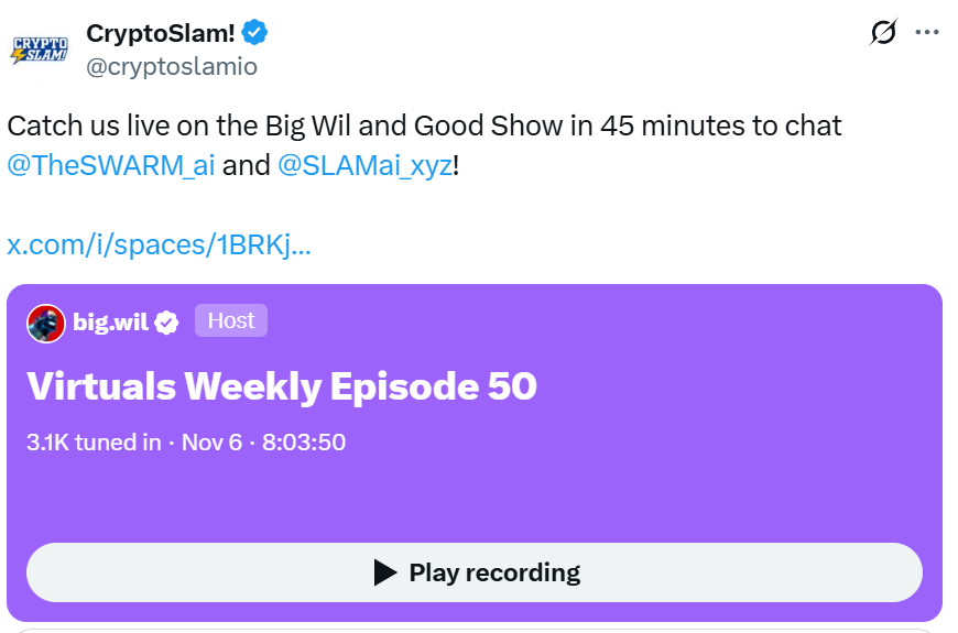 - Last week we took the conversation to one of the top shows in Virtuals, with our Head of Data, Scott, appearing on The Big Wil and Good Show. We shared with the 3.1K strong audience why SLAMai data is so powerful, and how we’re finding partners inside and out of the Virtuals ecosystem.