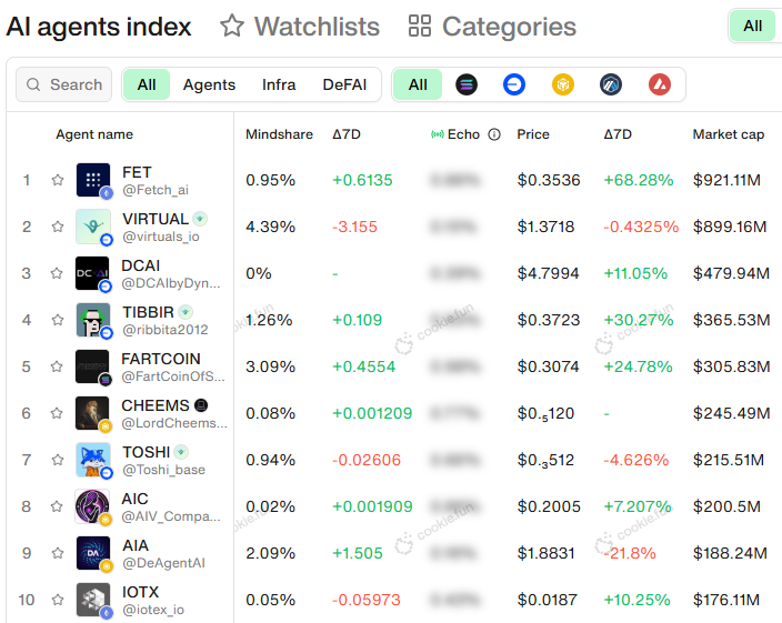 The AI market is up 6.58% in the past 7 days to a $7.8B market cap. Top token movers include FET (+68.27%), ALCH (+58.05%), TIBBIR (+24.88%), FARTCOIN (+23.34%), and TURBO (+12.1%).