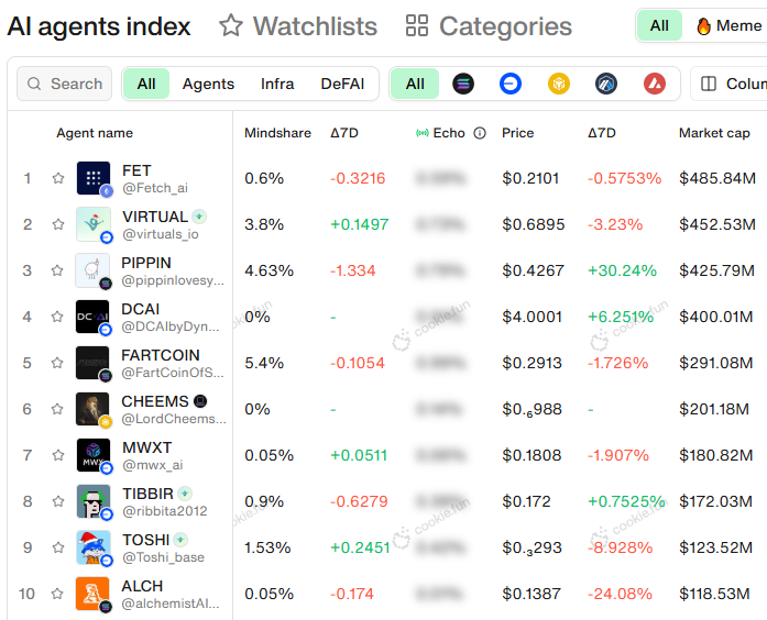 The AI market is down -0.01% in the past 7 days to a $5.39B market cap. Top token movers include PIPPIN (+30.24%), ALCH (-24.08%), REKT (-13.3%), TOSHI (-8.92%), and DCAI (+6.25%).