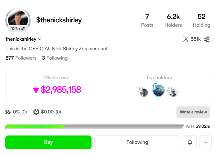 Surprising the crypto community, Nick also launched a creator coin on Zora, Base’s top tokenized content platform, called $THENICKSHIRLEY.