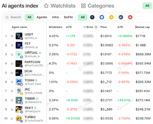 The AI market is up 27.36% in the past 7 days to a $16.95B market cap. Top token movers include IRC (+851.6%), COPY (+181.5%), WIRE (+104%), AGIALPHA (-75.81%), and BAMBOO (-70.06%).
