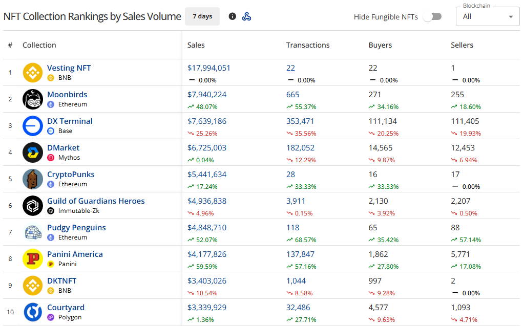 - Sellers, buyers, and txns all declined, but were offset by average NFT sales prices climbing 46.17% to $80.57.